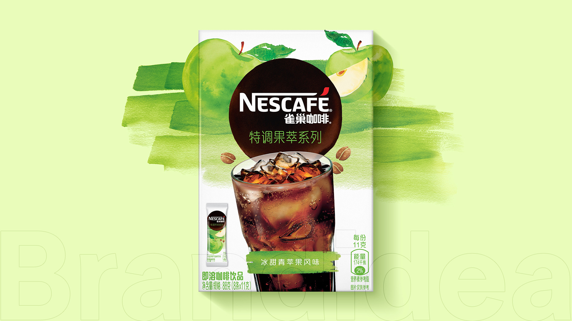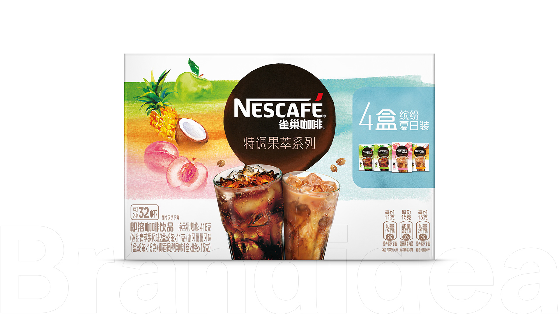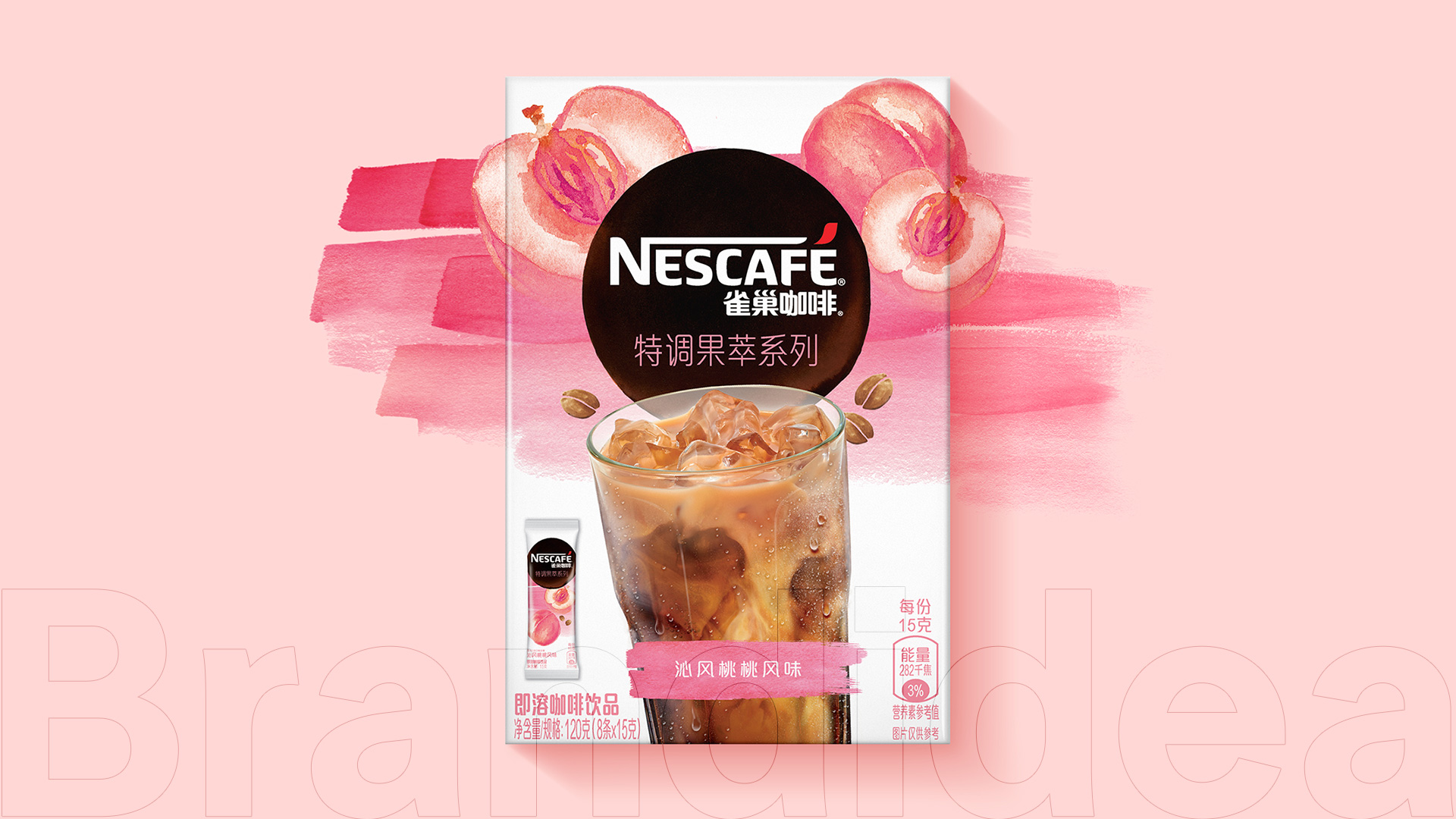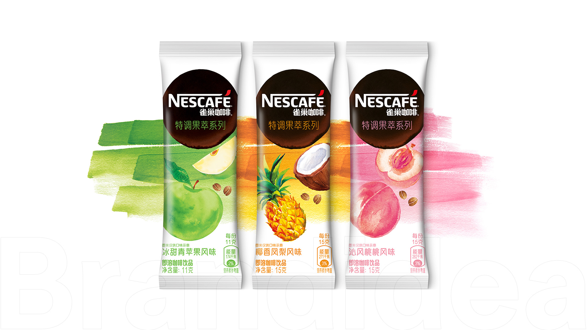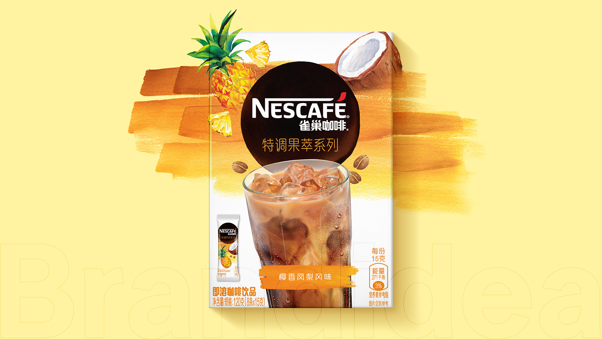 雀巢咖啡特调果萃系列的包装设计,围绕新品类属性与消费者认知展开,重点在于清晰区分传统咖啡与果味融合产品的视觉表达。设计通过整体视觉系统的梳理,在品牌一致性与产品差异化之间取得平衡,使系列产品在货架环境中具备良好的识别度与整体感。包装在视觉层级、信息传达与陈列效果上进行了系统化处理,既回应年轻化、多元化的消费趋势,也保持雀巢咖啡一贯的专业与稳定品牌形象。