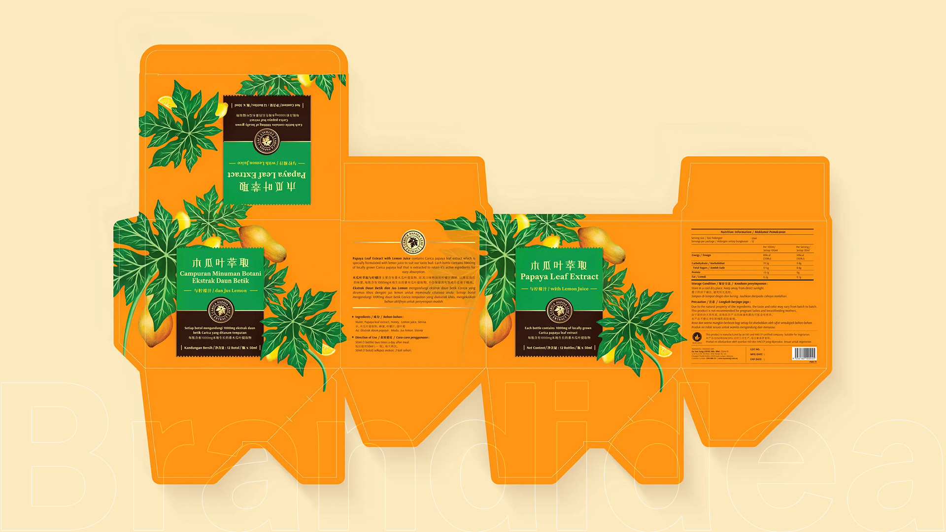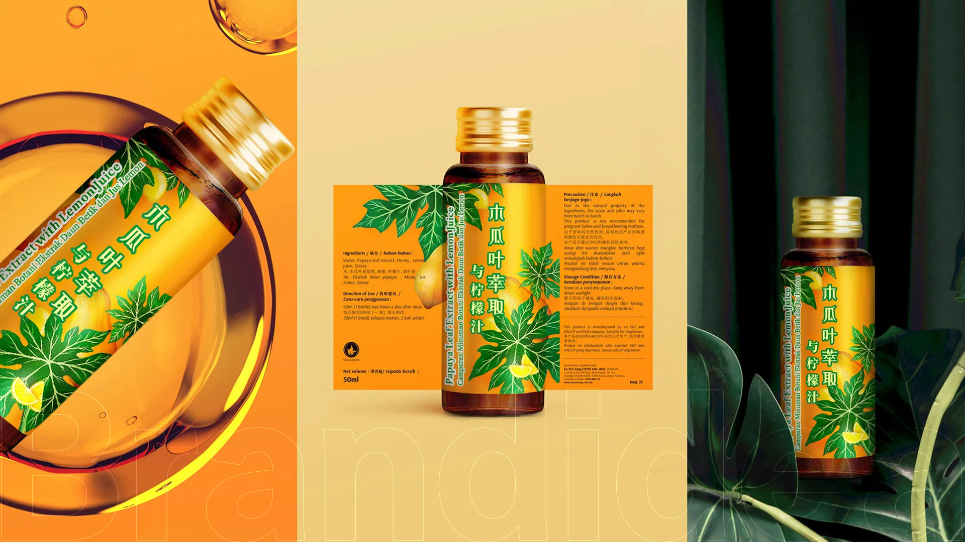 木瓜叶提取汁的包装设计围绕功能性饮品的日常使用场景展开,兼顾产品识别、饮用便利性与视觉吸引力。设计通过明确的视觉层级与色彩策略,使核心原料与产品特性在货架上易于被感知,同时弱化传统功能饮品的距离感。整体包装在保持专业与可信感的基础上,强化轻松、易入口的体验印象,使产品更自然地融入快节奏的日常生活,建立兼具功能属性与亲和力的视觉表达。